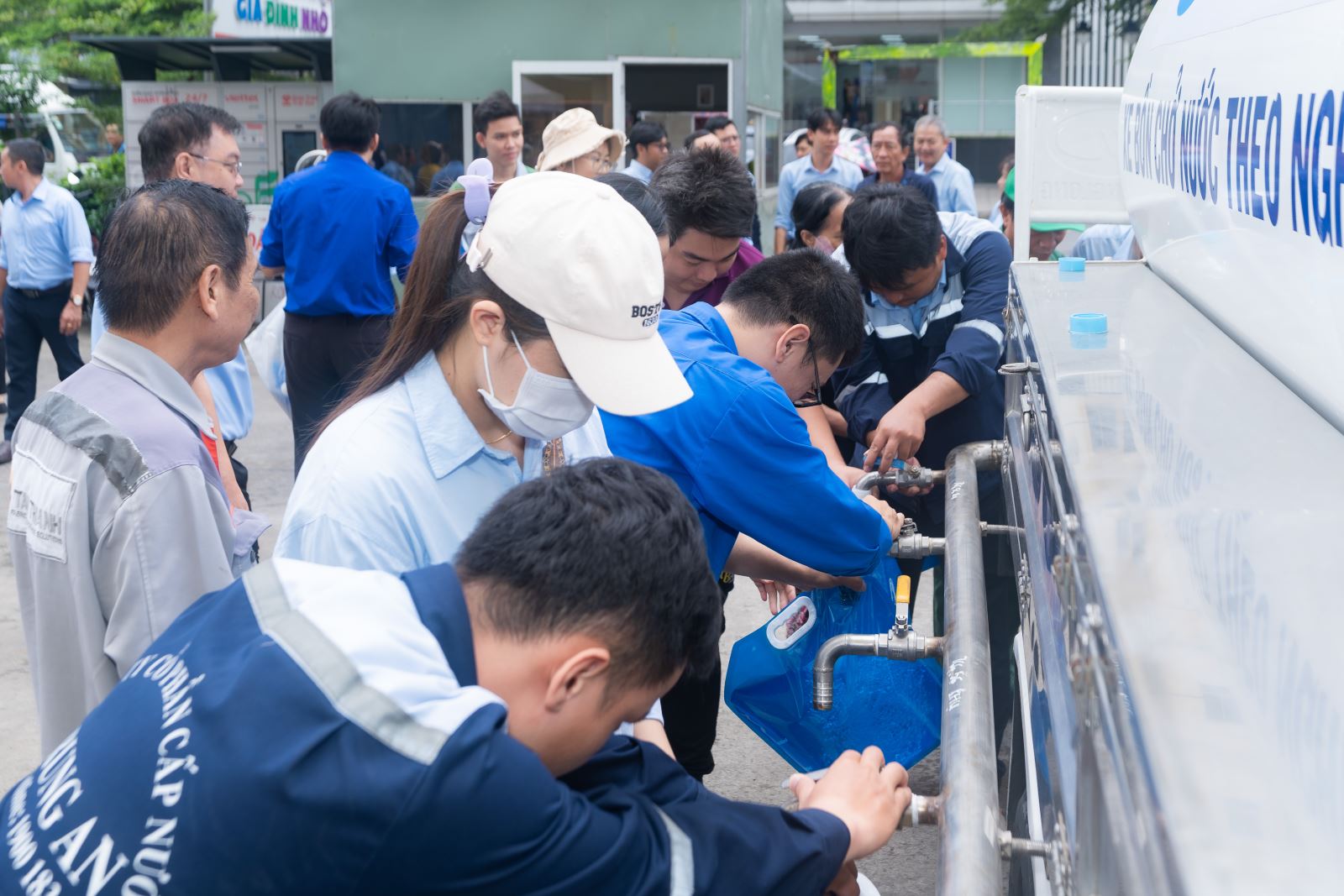 Ông Nguyễn Minh Hải - Phó Giám đốc Công ty trao túi nước cho người dân.