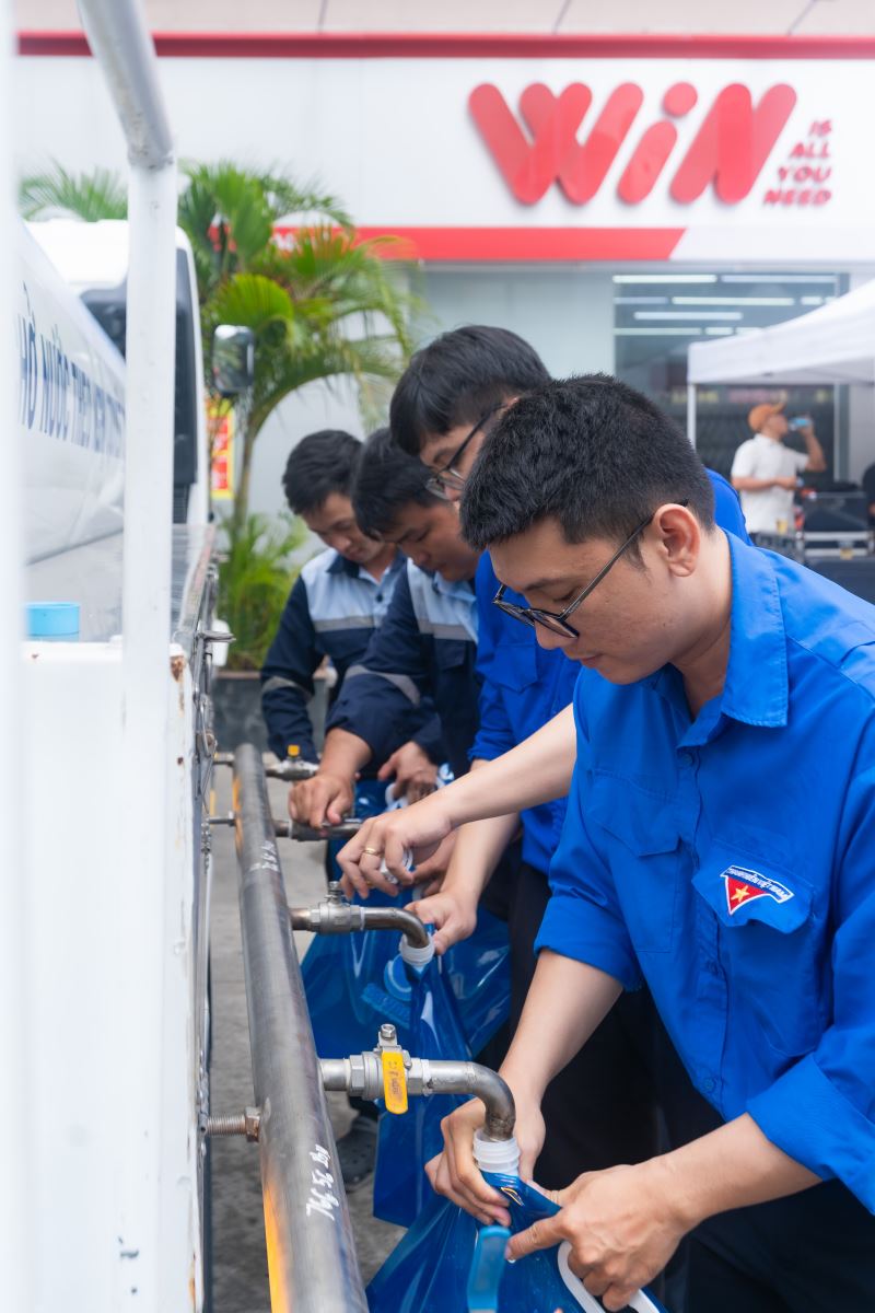Đoàn viên thanh niên hỗ trợ bơm nước vào túi đựng.