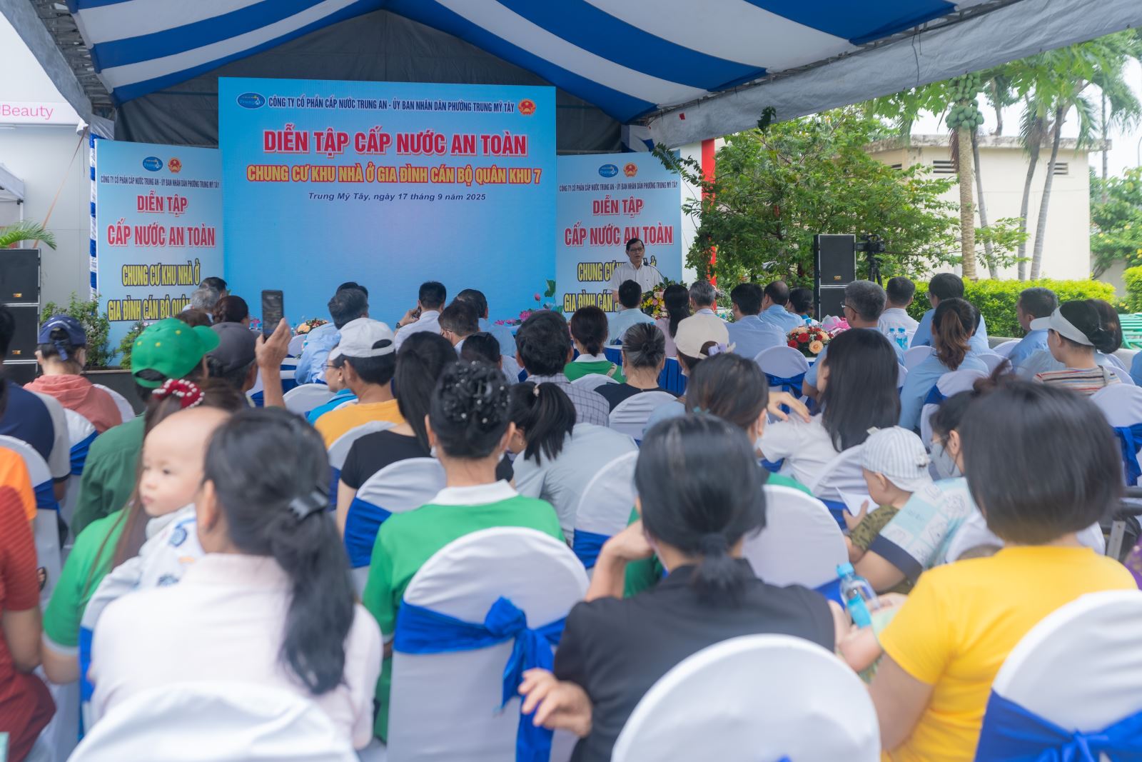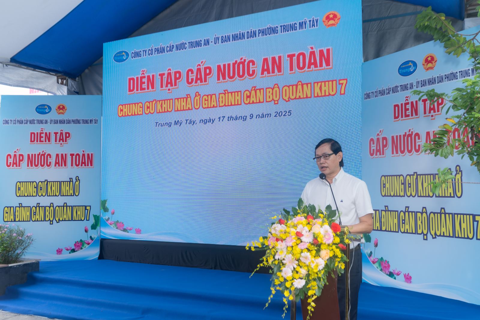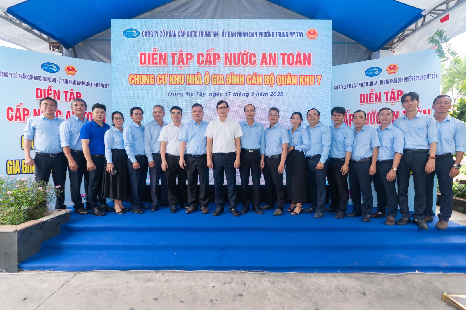 Sáng ngày 17/9/2025 Công ty cổ phần cấp nước Trung An đã thực hiện diễn tập cấp nước an toàn tại chung cư Khu nhà ở gia đình cán bộ Quân khu 7 với tình huống “bể ống cấp nước DN100mm tại trước số nhà 61, đường Trung Mỹ Tây 13A, Phường Trung Mỹ Tây, Tp Hồ Chí Minh.”