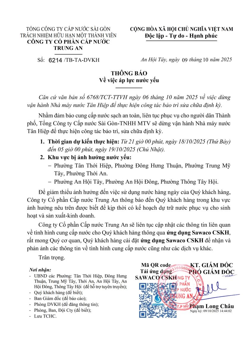 Thông báo về việc áp lực nước yếu: từ 21 giờ 00 phút, ngày 18/10/2025 (Thứ Bảy) đến 05 giờ 00 phút, ngày 19/10/2025 (Chủ Nhật).