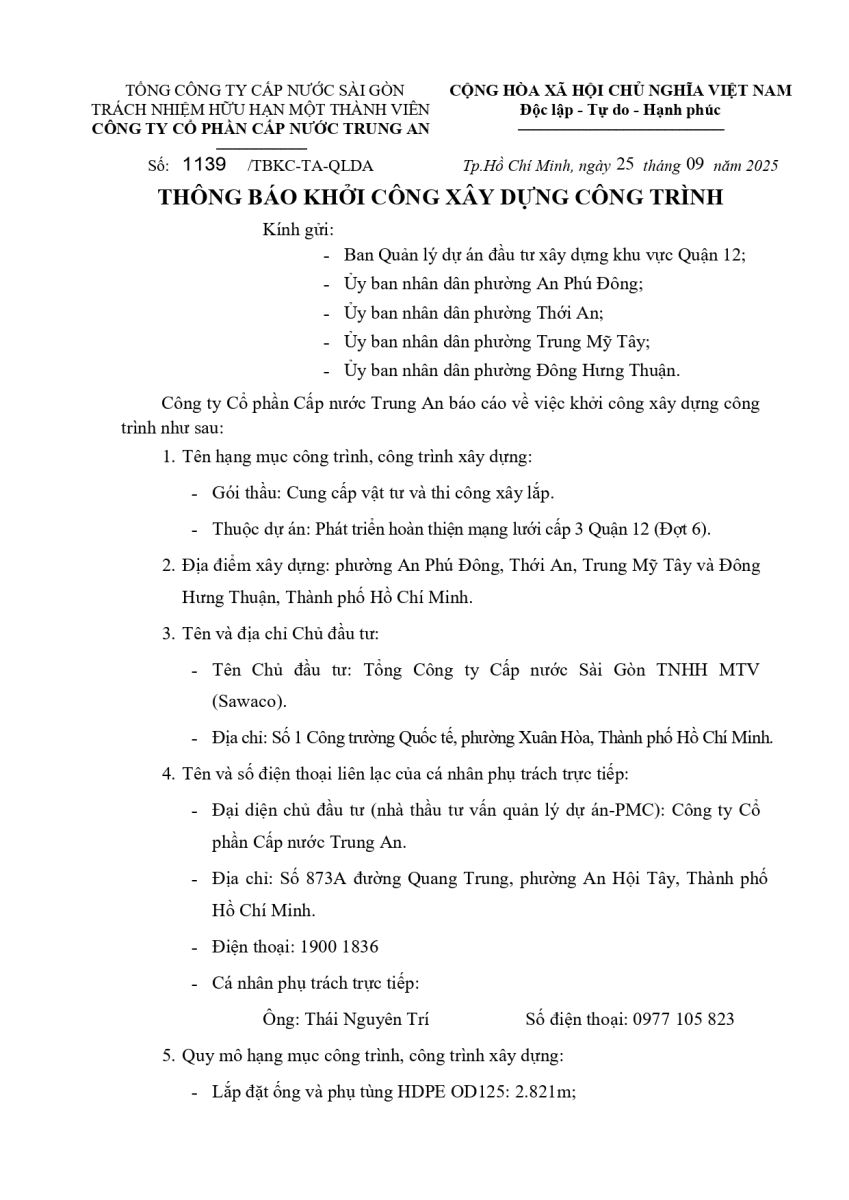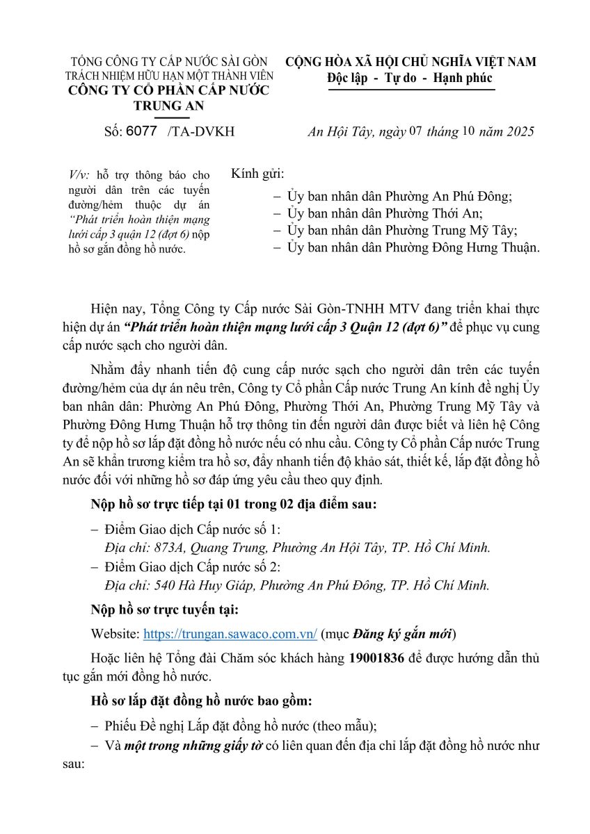 - Thông báo gửi các hộ dân có nhu cầu gắn đồng hồ nước trên địa bàn phường An Phú Đông, phường Thới An, phường Đông Hưng Thuận, phường Trung Mỹ Tây