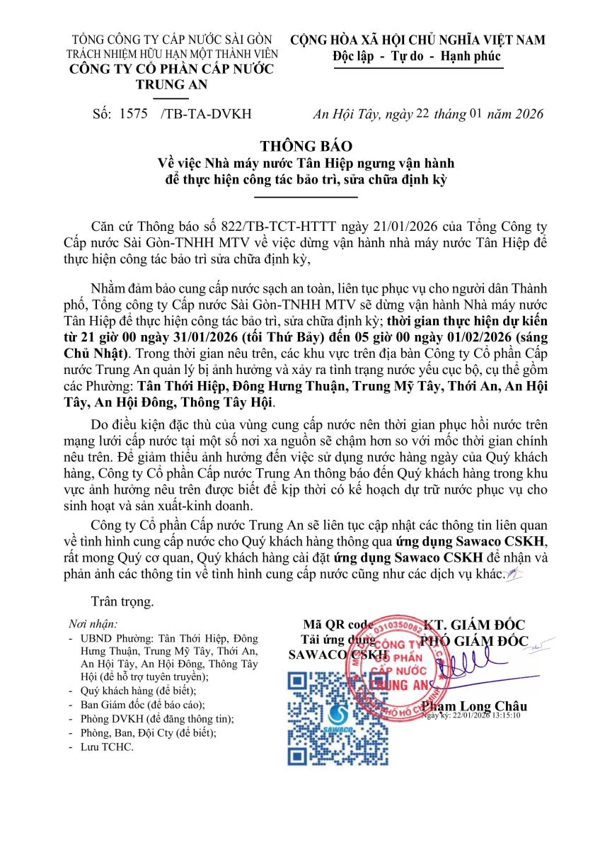 - Thông báo về việc nhà máy nước Tân Hiệp ngưng vận hành để thực hiện công tác bảo trì, sửa chữa định kỳ