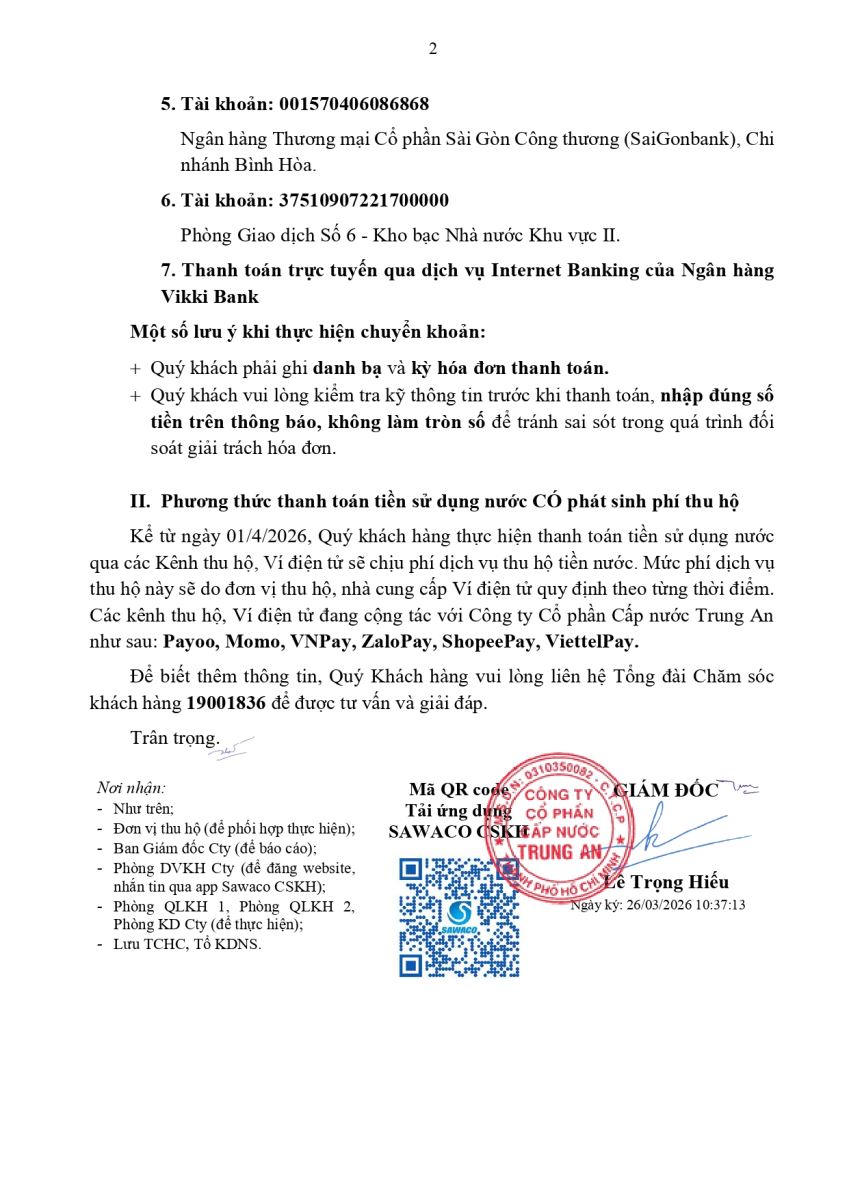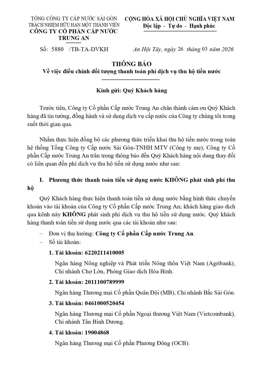 Thông báo về việc điều chỉnh đối tượng thanh toán phí dịch vụ thu hộ tiền nước